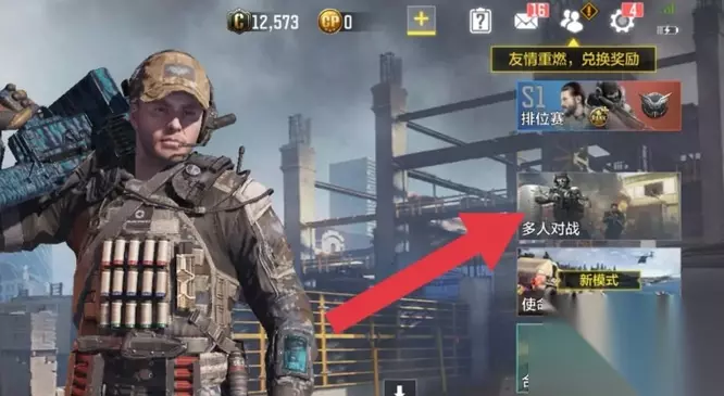 《使命召唤》自定义房间开启方法 答:在私人房间里邀请好友即可。 1、玩家打开游戏后,在主页面点击右侧多人对战模式进入,如图所示。