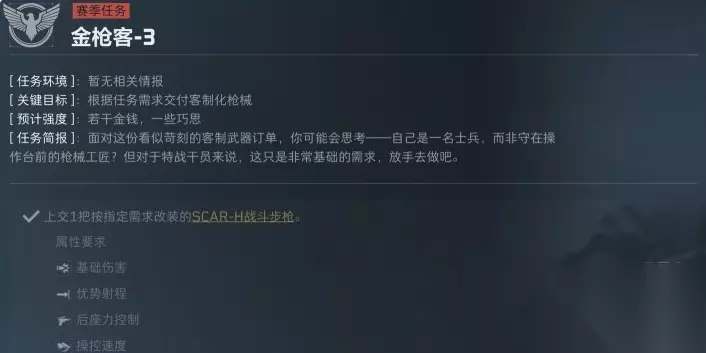三角洲行动S5赛季金枪客3改装方案: 一、S5金枪客3任务介绍 【任务目标】:上交3把按指定需求改装的【SCAR-H战斗步枪】 【属性要求】:后坐力控制:≥77;据枪稳定性:≥64;但对改装的基础伤害、优势射程、腰际射击精度均无要求;