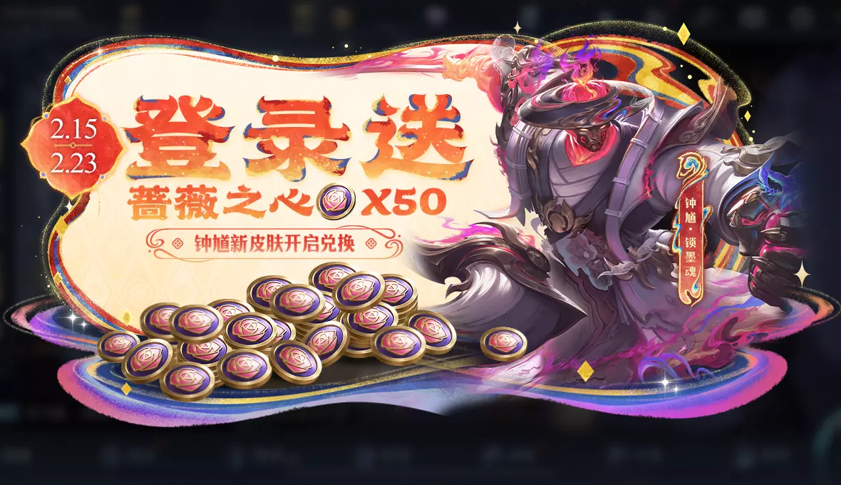 2月15日-2月23日,登录就送蔷薇之心×50!钟馗新皮肤即将开启兑换!