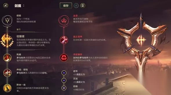 剑魔的符文点法依然选择以征服者为基石符文,搭配的是固定的凯旋与致命一击组合,第三行注意要点出韧性,副系则点出两个续航型的符文。 附加属性中由于经常对阵AP,因此选择点出魔抗。