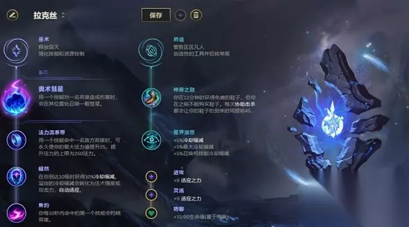 在符文上选择消耗能力最强的彗星搭配焦灼,然后搭配流系带与超然两个高性价比符文,副系则点出神奇之鞋与星界洞悉,让拉克丝省钱的同时获得更多的冷却缩减属性。 附加属性中点出两个伤害型符文,搭配一个成长生命。