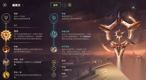 在两个符文的配合霞,派克的大招CD会非常短,中期的发挥空间最大,多打中期小规模团战找正确的进场机会大招收尾分享金币,帮助队伍快速滚起雪球,装备成型后派克的单杀与打5V5团能力也同样很强。 下路:强攻德莱文 在一众暴击ADC成为版本主流的情况下,德莱文在这个版本中的胜率提升幅度非常大,是非常推荐大家去选用的一个射手英雄。 符文出装