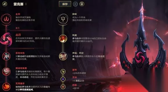 在基石符文上选择点出丛刃,来提升雷克赛在最短时间内打出的爆发能力,之后点出恶意中伤搭配眼球和无情猎手,副系则点出凯旋与欢欣。 附加属性中点出一个攻速和一个护甲,与蜘蛛相同。