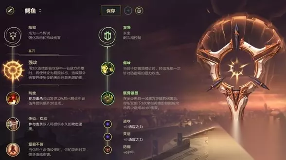 符文上的两个关键分别是基石符文强攻和最后一行的坚毅不倒,配合鳄鱼本身的低血量高怒气Q技能的爆发伤害,配合骸骨、凯旋等高性价比符文。 附加属性点出一个护甲搭配两个适应之力。