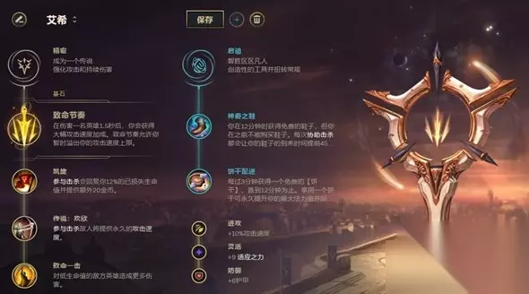 德莱文的被动决定了,只要能拿下一个人头就可以快速起飞,同时顺利地统治下路,拿下一血塔或者更多的人头,投入到中期的作战中,中后期的团战打法上,德莱文需要更好地注意自身的走位,同时确保自身至少有一把斧子可以打出爆发输出。 下路:致命节奏艾希 另外一个在当前版本中胜率有大幅度增长的符文就是艾希,这个英雄拥有非常全面的ADC属性,非常适合不同风格的玩家选用。 符文出装