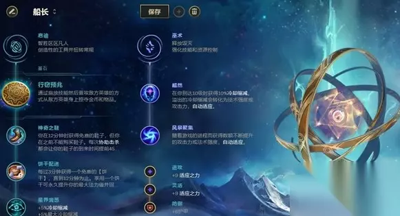 在符文上选择偷钱流行窃预兆,搭配神奇之鞋与饼干配送,最后一行点出星界洞悉,搭配副系的超然,同时再点出一个风暴聚集提升后期属性。 附加属性中点出两个适应之力和一个护甲,护甲可以换成生命值。