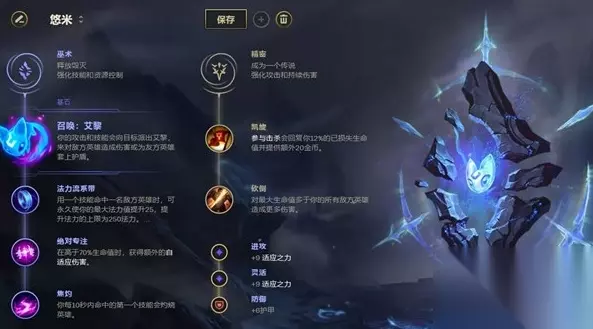 悠米作为一个软辅,基石符文艾黎无疑是最好的选择,以艾黎搭配悠米再搭配队友效果非常,之后点出法力流系带、绝对专注与焦灼。 副系中点出一个砍到,搭配凯旋符文,附加属性中点出一个护甲。