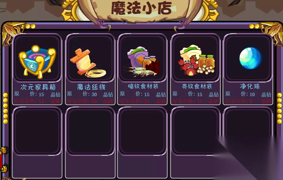 二、魔法小店 在魔法小店里,我们可以通过晶钻来购买各种商品,晶钻的获取方式有2种,一种就是铸造晶钻,另一种就是碎片合成晶钻,我们可以通过开通红宝石特权来获得晶钻礼包,或者是通过 晶钻碎片合成晶钻,当你成为红宝石岛民后就会获得额外的合成加成哦。 目前可以兑换的具体奖品有:次元家具箱,魔法丝线,暗纹食材袋,亮纹食材袋,净化珠。
