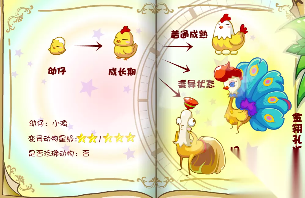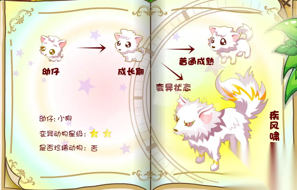 在动物捕捉手册里,我们可以看见动物的变异的各个时期,例如幼仔,成长期,然后成长期后会迎来一个分叉生长,一个是会普通成熟,一个是变异状态模样。有的生物只有一种变异状态,而有的有2种,总之奥比岛的神奇变异动物有很多,等待大家去探索发现。
