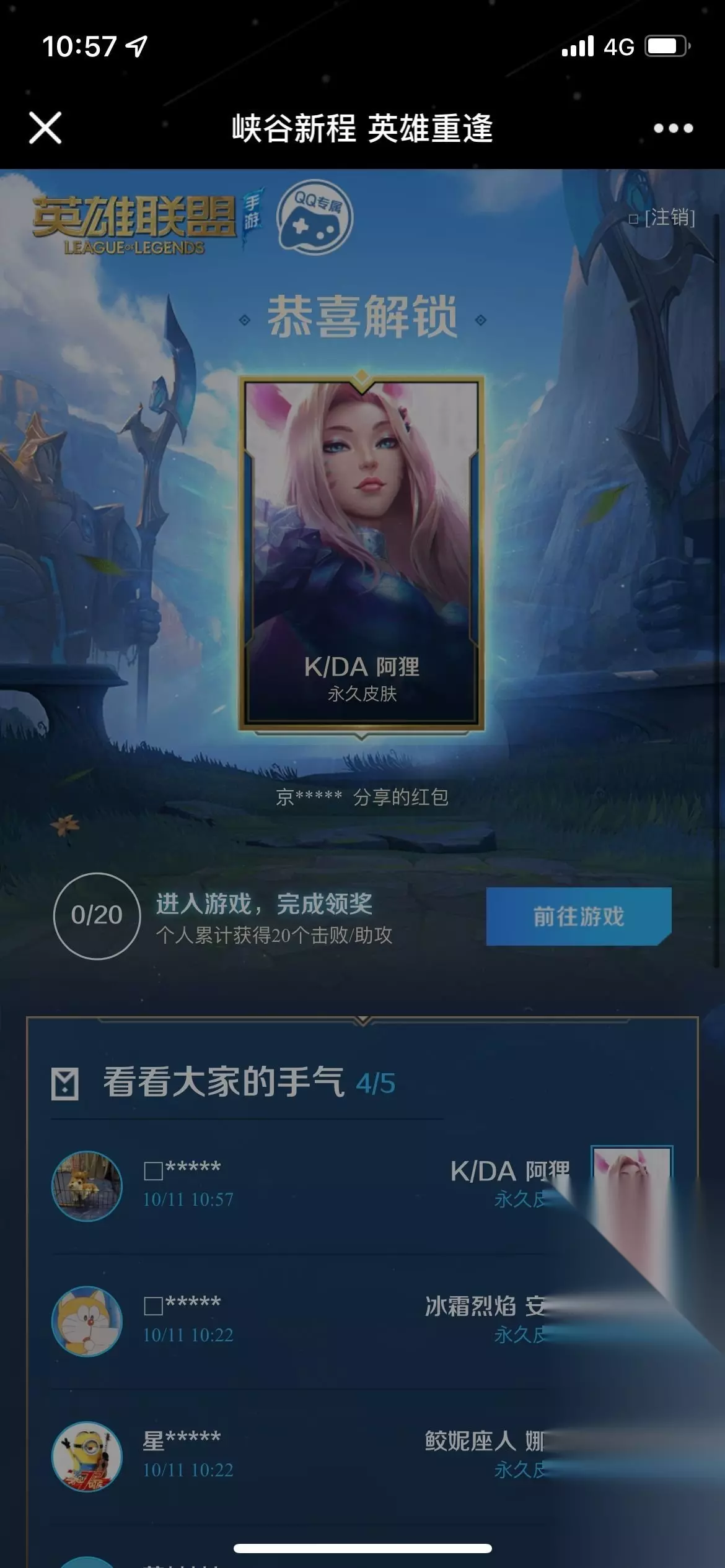峡谷新程红包领不了解决方法 如果说玩家点击分享的链接是直接空白的,领取不了奖励,那么转发一下就行了。 还有一种情况是玩家一直在玩lol游戏,但是峡谷新程活动中却显示活跃等级为0,有可能是玩家转区或者改名的原因,建议玩家爱找客服填表申诉,一起申诉等官方解决。