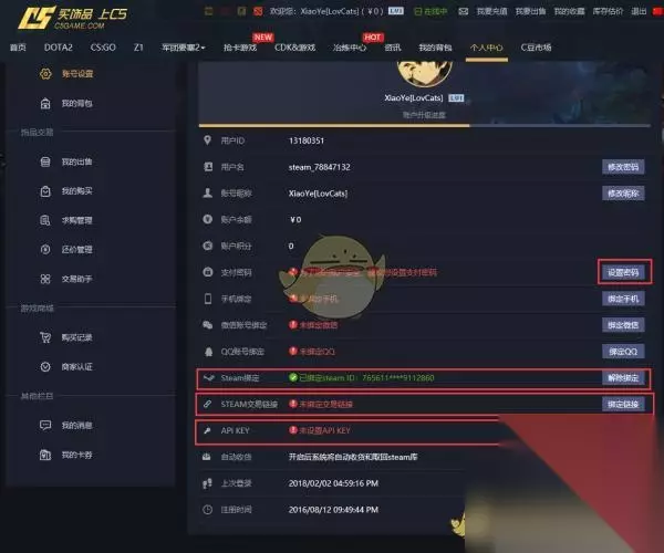 3、依次绑定手机、Steam链接、交易链接等