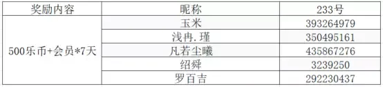 将在正确参与活动的玩家中,随机抽取5名玩家送出500乐币+233会员*3天