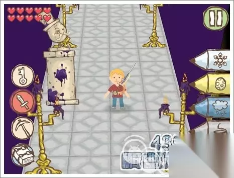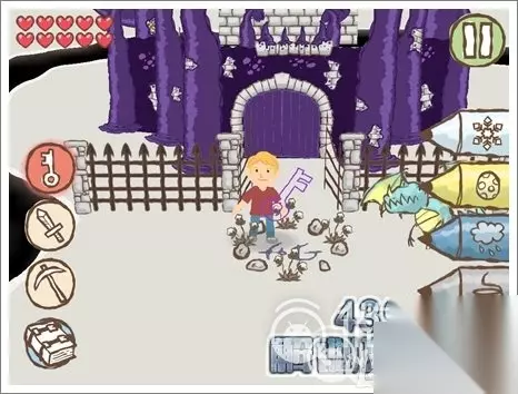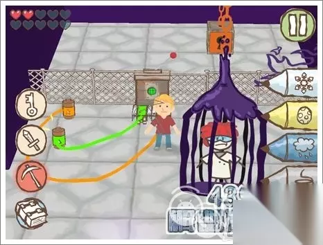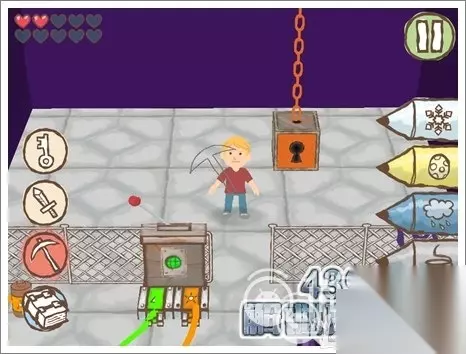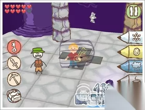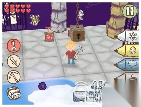 3.使用冰铅笔将水冰住,就可以继续前进。看见如图所示的有钥匙孔的位置,画个相同颜色的钥匙即可打开。