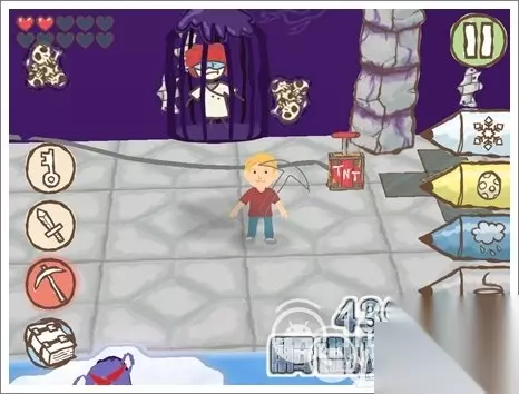 5.到达右上角的位置后,使用锄头将柱子打掉,然后就会出现绿色的钥匙孔,画上绿色钥匙即可打开,就能救出矿工。