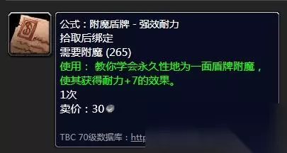 在游戏《魔兽世界怀旧服》中,附魔盾牌强效耐力图纸是由幽暗城的丹尼尔·巴特莱特和泰达希尔的迈斯林迪尔出售的,对应阵营的玩家可以前往这两个商人处购买。玩家使用该图纸需要265点附魔来使盾牌获得附魔+7效果。