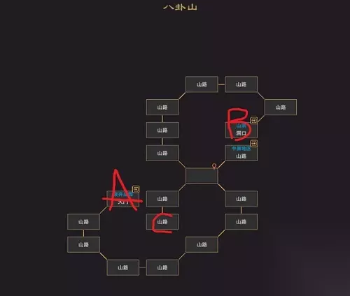 《我来自江湖》墨子剑法获取方法 1.一共有三个入口ABC,A和B是拿钥匙的洞穴,C是隐藏入口,是最终用钥匙拿功法残卷的地方。(如图,八卦山图)