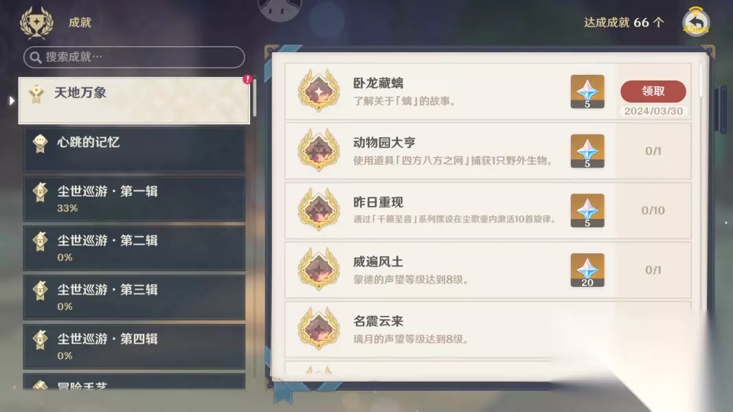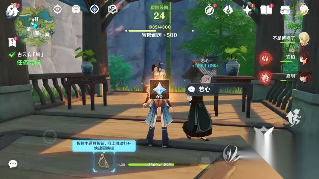 任务完成,奖励60原石,1成就,1璃月地灵龛钥匙和500冒险经验