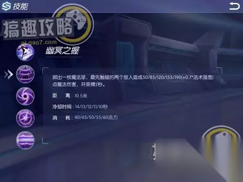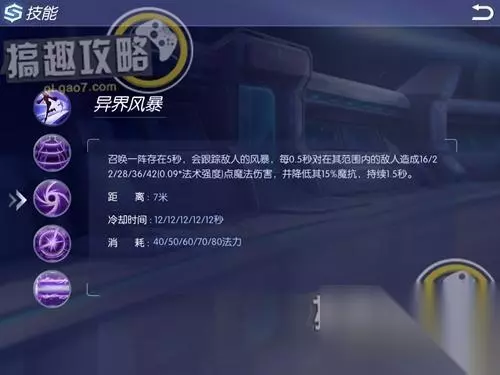 主动技能异界风暴:召唤一阵存在5秒,会跟踪敌人的风暴,每0.5秒对在其范围内的敌人造成16/22/28/36/42(0.09*AP)点魔法伤害,并降低其15%魔抗,持续1.5秒。 距离:7米 冷却时间:12/12/12/12/12秒 消耗:40/50/60/70/80法力