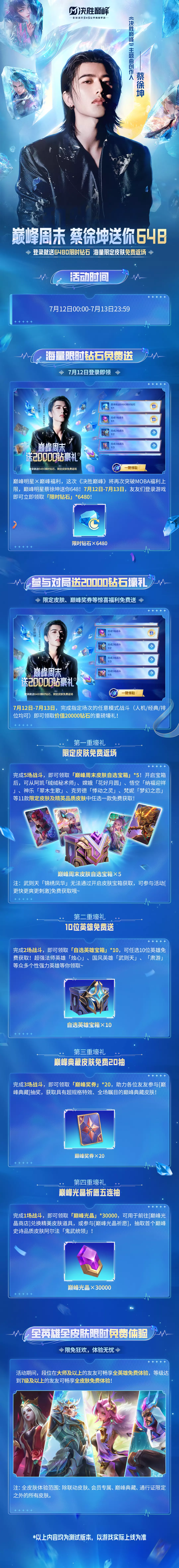 7月12日0时-7月13日23:59,登录游戏即可立即领取主题曲创作人蔡徐坤送出的「限时钻石」*6480!