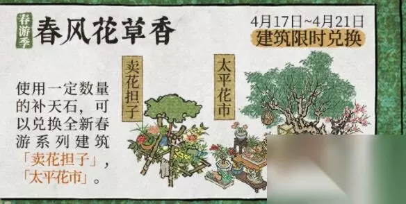 《江南百景图》太平花市获得方法介绍: 建筑故事: 虎大爷每天早上从观星台下来,都要到太平花市遛鸟:把鸟笼挂在一旁的树上,在茶楼找个靠近窗台的位置,坐下慢慢品着清茶。 上午店里的茶客少,空气中散发着花草清香,四周的鸟叫声也很悦耳。这是一天最清闲的时候。 快到中午的时候,虎大爷便提着鸟笼离开太平花市:「该回家给老娘做饭了呀。」 获得方法: 4月17日~4月21日期间,玩家只要参加春游季春风花草香活动,然后使用一定数量的补天石,就可以兑换全新春游系列建筑太平花市。