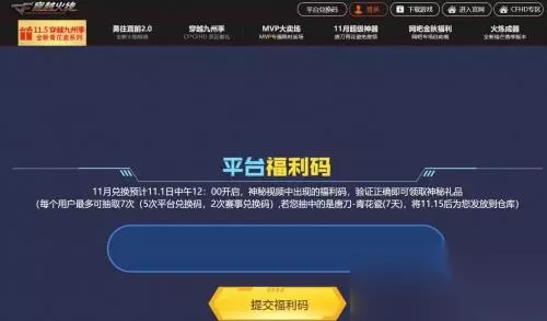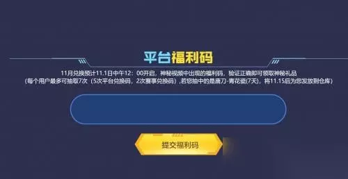 领取奖励的方法 11月兑换预计11.1日中午12:00开启,神秘视频中出现的福利码,验证正确即可领取神秘礼品。 (每个用户最多可抽取7次(5次平台兑换码,2次赛事兑换码),若您抽中的是唐刀-青花瓷(7天),将11.15后为您发放到仓库) 小伙伴们赶紧去领取吧。
