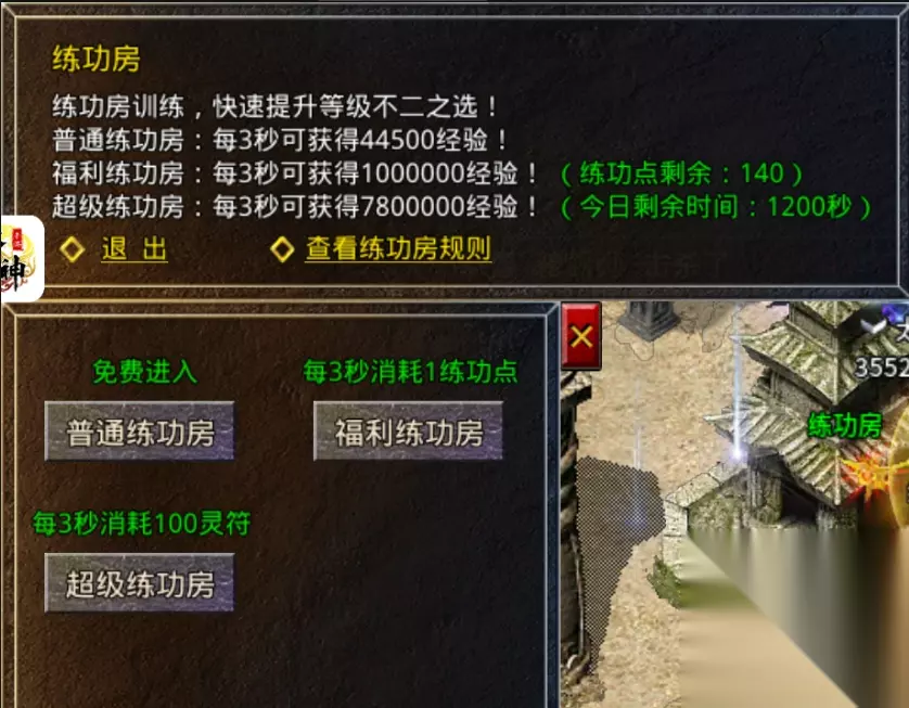 升级冲榜《练功房》 由于经验丹一天只能吃300个,所以想要冲榜的玩家还可以去练功房泡点 练功房分为三种,普通练功房、福利练功房、超级练功房 普通练功房:每3秒获得1次经验,每小时经验衰减《免费进入》 福利练功房:每3秒获得1次经验,每次扣除1练功点(每3秒消耗1练功点) 超级练功房:每3秒可获得大量泡点经验,每日可进入20分钟,等级越高经验越多《每3秒消耗100灵符》