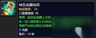 神圣武器涂层适用于法系,效果为施法有几率回蓝,内置45秒CD,因此意义不大。但是正义武器涂层适用于物理系,效果是攻击有几率触发300点攻强,持续10秒,内置CD是45秒,是一个非常非常强力的武器临时附魔。日常任务每天只能奖励一个,但是该物品并不绑定,到时候玩家可以从AH购买,不需要的玩家也可以做了拿去卖。 小O说 TBC怀旧服最终阶段是一个非常友好的阶段,不仅有新声望破碎残阳给大家提供大量的优质声望物品,而且还有新的146牌子装可供玩家选择,无论是大号查漏补缺还是武装小号都非常方便。明天开始还会开放太阳之井高地团队副本,小怪的大量极品装备图纸也必将会掀起一股热潮。