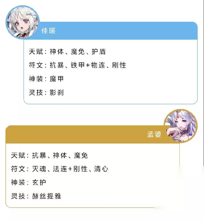 孟佳组合 作为佳瑶高出场率下的极端组合,在配合上孟婆能代替复活辅助的作用,此外30魂器附加防御+20%的属性也能很好反哺佳瑶和一众急需生存的战士,主C是哪吒、波塞冬、人马等阵容都是能出场的时机!