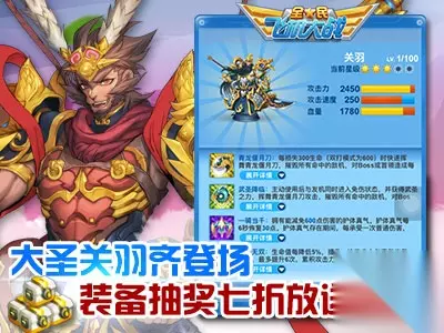 大圣关羽齐登场 装备抽奖七折放送 6月17日至19日,深受玩家喜爱的三国名将战机“关羽”七折上架,仅售1882钻石!武圣降临谁能与共?护体真气再战乾坤!同期,带领无数机友突破历史闯关过阵的斗战胜佛战机“齐天大圣”八折登场,仅售2151钻石!低价带走猴哥的机会千载难逢,赶紧来抢吧! 同期,游戏商城重磅开启装备抽奖七折活动,助力各位玩家早日囊获心仪装备,获得更佳的装备加成与技能强袭! 装备钻石抽奖单抽、十连抽前10次皆可享受7折优惠! 装备金币抽奖单抽、十连抽前10次皆可享受7折优惠!