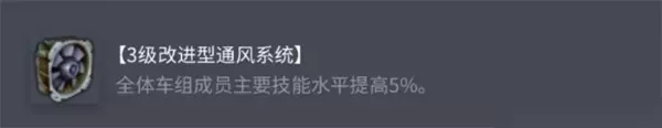2、3级改进型通风系统 效果:全体车组成员的主要技能水平提高5% 优点:这个配件能够提升车组成员的综合作战能力,包括驾驶员、炮手和车长等各项技能。这对于T110E5这种需要保持持续战斗力的重型坦克来说,提升全员技能能够显著提高整体性能。