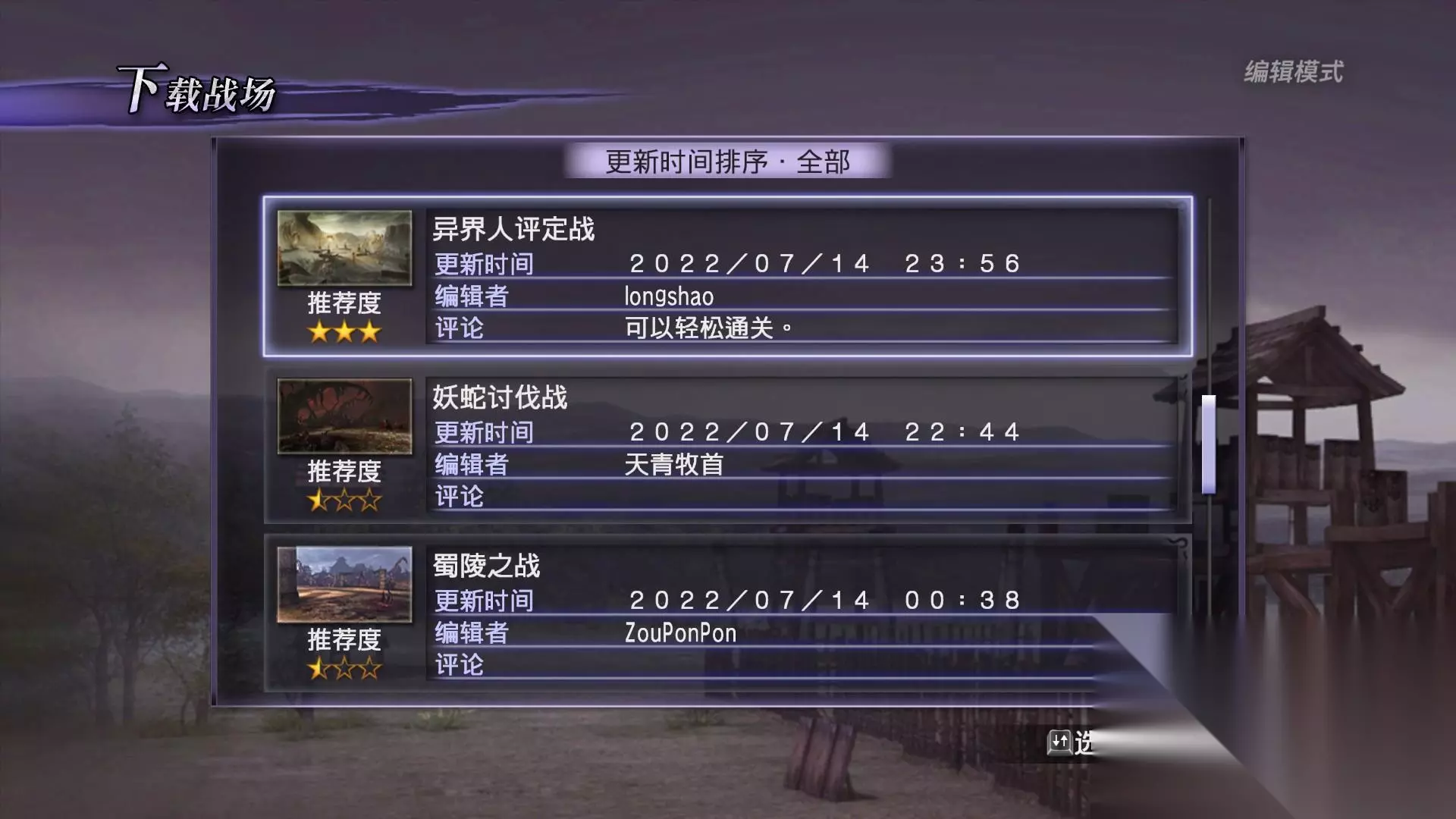 除此之外,真·无双模式也是让《无双大蛇2 终极版》的可玩性大大提高的一个玩法。这个玩法其实有点类似于游戏内置了一个创意工坊,玩家可以在这个模式里对已经通关的故事关卡地图进行编辑,打造出自己想要的战场,出场的杂兵种类、武将的台词和战斗姿态等要素都可以在这里进行自定义,而且编辑完成后的关卡地图还可上传至服务器,与全球玩家分享,当然你也能下载其他玩家上传的关卡地图。这个可以让玩家打造UGC内容的玩法让《无双大蛇2 终极版》的游戏可玩性不再局限于游戏本身,也让游戏的寿命大为延长。