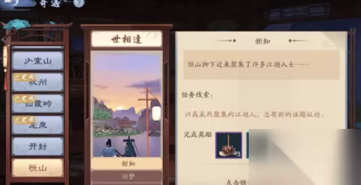 《新笑傲江湖》世相逢奇遇任务完成攻略 答:完成新知、旧梦、惊鸦三个任务即可。 任务一:新知 1. 首先解锁线索:聚集的江湖人。