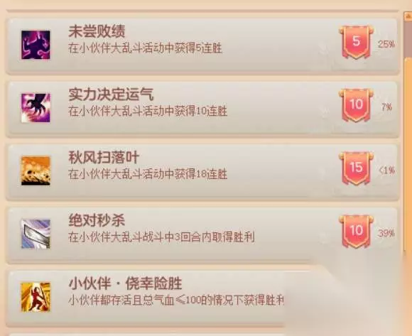 额外技能选择 四、活动成就 连胜系列有未尝败绩、实力决定运气、秋风扫落叶等成就,需要玩家达到连胜若干场次。各位少侠小伙伴培养成型之后多参加几周活动,10连胜也绝非难事。 绝对秒杀要求3回合取得胜利,推荐3敏攻小伙伴阵容,2-3回合取胜非常容易。 侥幸险胜:3只小伙伴都存活并且气血≤100的情况下获胜,考验机缘巧合,多打几次总会有机会达成。