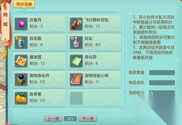 投掷骰子 TIPS:在一位玩家先手投掷骰子之后,留给另外一位玩家的战斗时间会立刻缩短到3秒。为了把握住骰子带来的特殊效果加成,各位小伙伴在战斗过程中,可要集中注意力,及时操作投掷骰子哦! 神武4小伙伴大乱斗活动中,胜利一场获得4点活动积分,失败一场获得3点活动积分,累积战败5场则淘汰出局。活动的积分可以用来兑换还童丹、宠物炼化丹等实用游戏道具。当然,如果一次活动获得的积分不够兑换心仪的物品也不要紧,因为积分可以累计到下周继续使用!