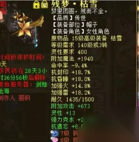 帽子属性一览: 帽子的属性更加给力!同样选择灵性加成,而且强力克属性也非常的高!唯一缺点可能就是原始属性加强火法有点低,不过人家可能只是为了高强雷,这一点也可以忽略。套装属性依然是非常高的强力克水,从这一点上足以看出玩家打造细节上绝对没少下功夫。