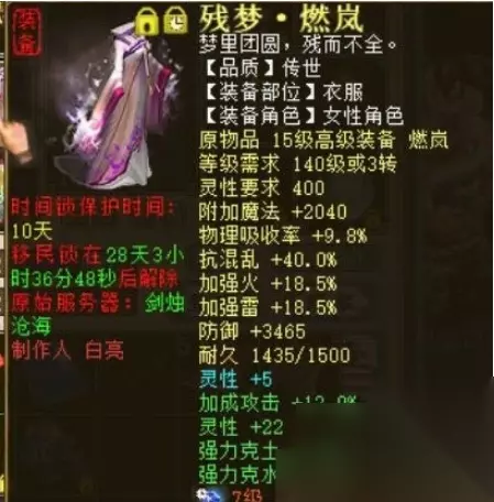 衣服属性一览: 双强火、雷两种法术,抗性也非常的到位。炼化上选择了低克高灵性属性,毕竟太完美的装备不太好找。另外值得一提的是玩家的套装属性“强力克水”7.5确实不易,这一点洗过套装的玩家肯定深有体会。