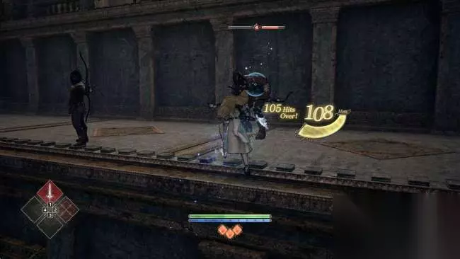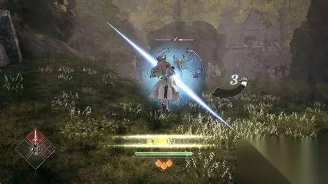 画面右侧还会显示一个连击槽,数字代表连击次数。 数字下方的能量槽则是最大间隙时间,只要在能量槽归零前再次打到敌人就会增加连击次数。 高连击会有高评价,也会更容易积累战技槽。