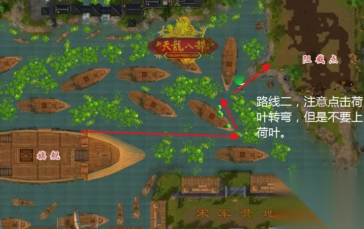 第二次自动寻路的坐标点位是(230,200),但是注意这个坐标必须要队长在水中才可以移动,如果队长是半卡在荷叶上,那么可以选择路线二,或者重新进行跟随卡位。具体路线图如下,: