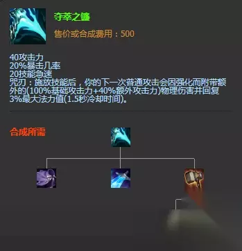 lol手游吸蓝刀攻略: 夺萃之镰又被大家称呼为“吸蓝刀”,在lol手游中吸蓝刀可以增加40点攻击力、25%暴击率、25点技能急速。拥有两种技能效果,其一“萃耀”,伤害性主动技能可以造成10额外物理伤害+70%AD的伤害,每个技能只能对目标触发1次该效果。其二“法力汲取”,普通攻击可以回复缺失法力值的2%。