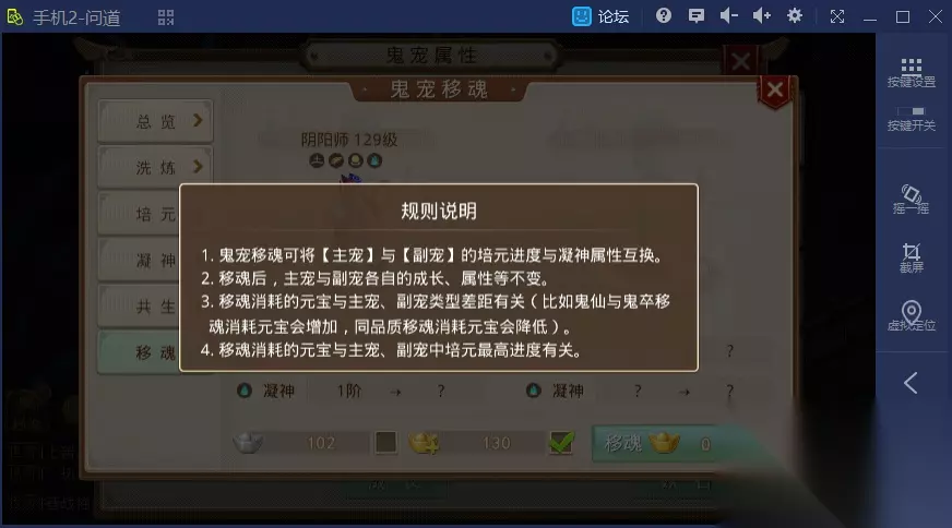 五、幽灵宠物移魂 当获得新的幽灵宠物时,可以将已培养的幽灵宠物的培元进度和凝神属性进行转移。然而,两只幽灵宠物进行移魂后,只会互换培元进度和凝神属性,等级、成长和属性等均不会发生改变。幽灵宠物的等级可以直接通过经验丹提升。