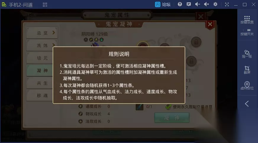 三、幽灵宠物凝神 幽灵宠物凝神通过消耗凝神草来增加属性或洗练幽灵宠物的属性。凝神属性槽共有五个,需要分别在培元达到一阶、三阶、五阶、七阶和九阶时才能开启对应的属性槽。 凝神草的获得方式: 在地下宫殿游戏中,通过完成游戏随机获得。 在地下宫殿行商人处,随机刷新并可购买。 在完成引魂入殿任务后,获得的盒子中随机获得。 在地狱大乱斗结束后,随机获得。