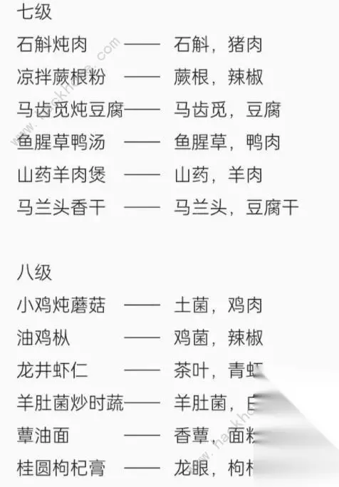 七级 石斛炖肉:石斛,猪肉 凉拌蕨根粉:蕨根,辣椒 马齿觅炖豆腐:马齿觅,豆腐 鱼腥草鸭汤:鱼腥草,鸭肉 山药羊肉煲:山药,羊肉 马兰头香干:马兰头,豆腐干 八级 小鸡炖蘑菇:土菌:鸡肉 油鸡枞:鸡菌,辣椒 龙井虾仁:茶叶,青虾 羊肚菌炒时蔬:羊肚菌,白菜 蕈油面;香蕈,面粉 桂圆枸杞膏:龙眼,枸杞子