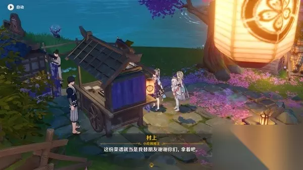 (2)游玩祭典 来到甘金岛后和神里凌华一起游玩祭典,分别为戴面具、抽签、品尝美食和绘马。在第3个项目品尝美食中会获得1张绯樱饼的食谱,学习后就能制作这个食物了。最后的项目绘马画完之后真的会一直存在,记得有空常回来看看哦!