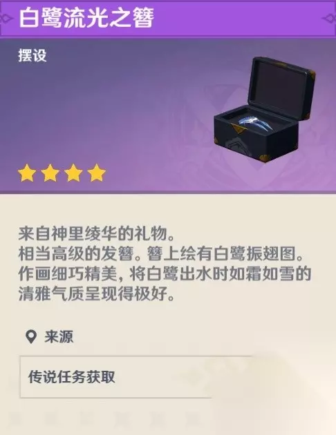 (3)返回小仓屋 在木南料亭用完餐后返回小仓屋取货品,同时神里凌华也为我们准备了1件礼物「白鹭流光之簪」。可以将它摆放进尘歌壶里,是个十分珍贵的礼物呢!