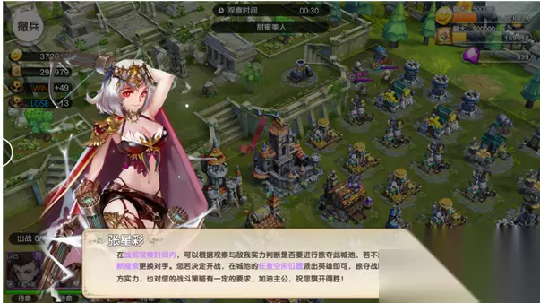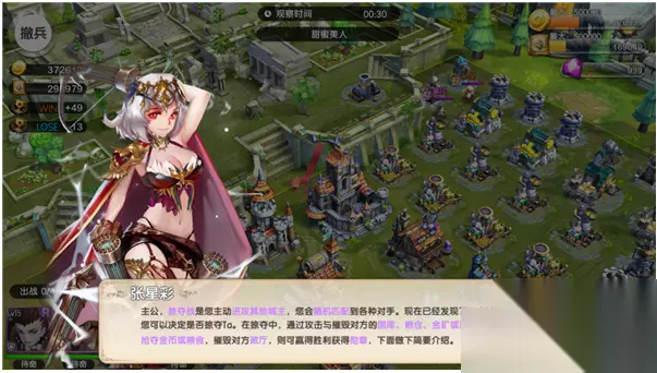 三、界面介绍 首次进入会有相关介绍,如下图所示,这里提一下引导中没有说明的一些东西: 1. 若在观察时间结束后,没有进攻或撤兵,默认攻打当前城池; 2. 胜利条件:摧毁政厅或摧毁率达到50%以上。
