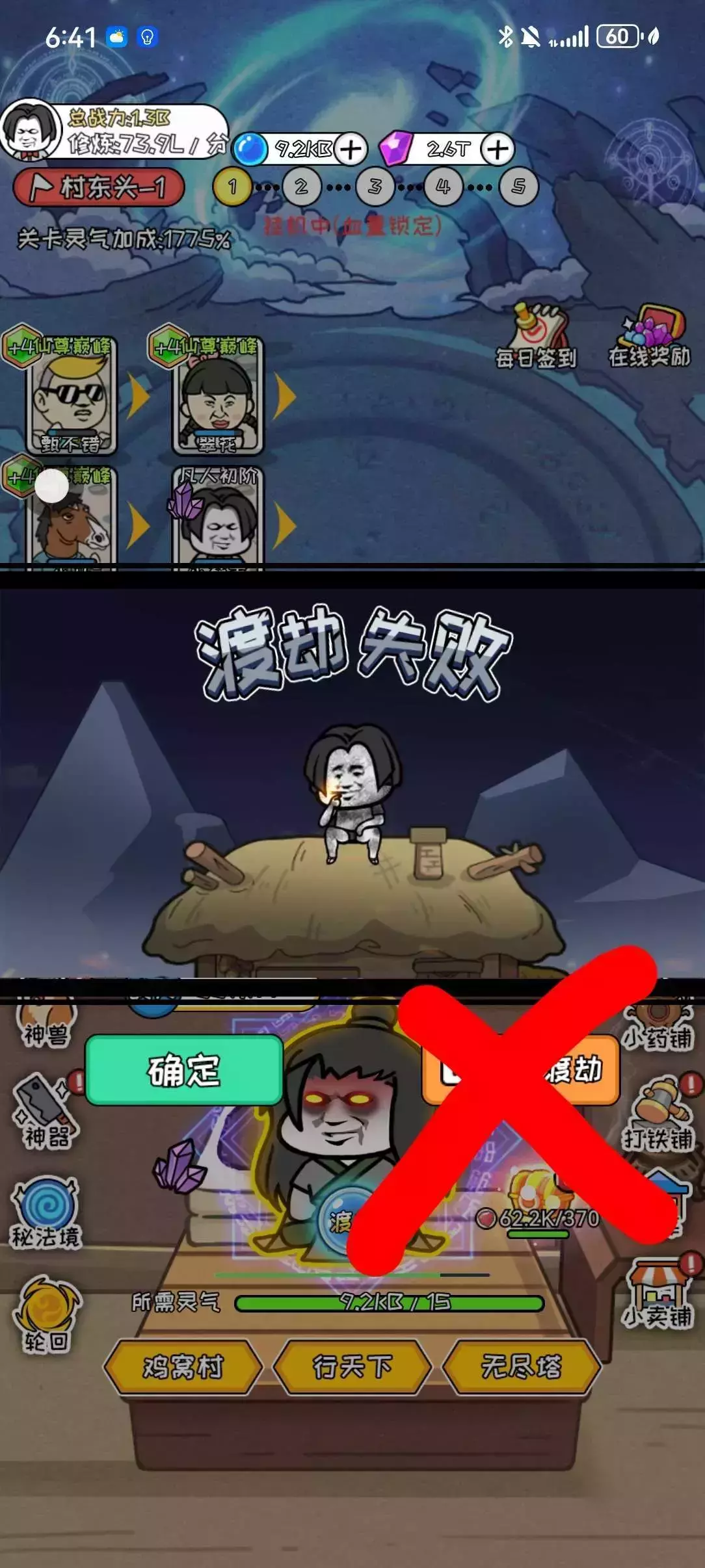 4、渡劫时大多数选择立即渡劫,可以减少免广告次数,如果渡劫失败(50%渡劫),一定不要选择再次渡劫,因为再次渡劫可能会再次失败,会浪费免广告次数。(如图6、7所示)