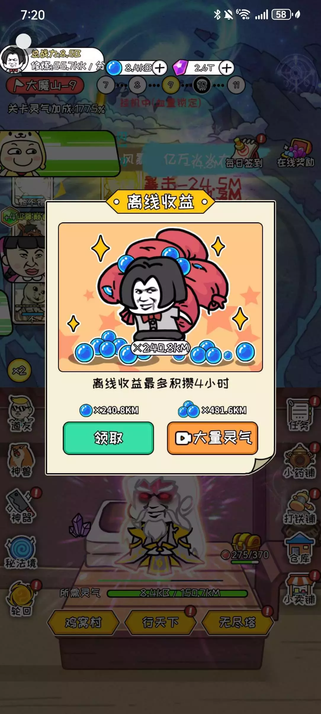 另外:每次离线收益最多4小时,建议先领取,然后再点击回到离线收益界面,收集大量灵气,可以获得更多的灵气。(如图9所示)