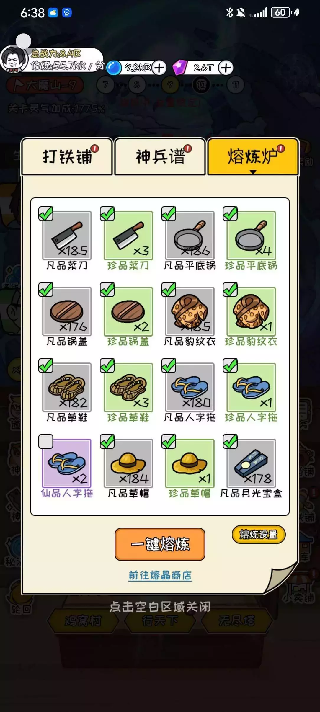 2、装备:每次轮回需要快速通关可以获得神器碎片,咱们都知道大侠斗笠碎片和时空灵玉碎片仅可在“外星球”和“精神界”获得,所以它们两个的数量基本上都比其他的还少。其次在熔金商店获得毕业套装备,熔金在熔炼炉分解多余的装备可获得。(如图2、3、4所示)