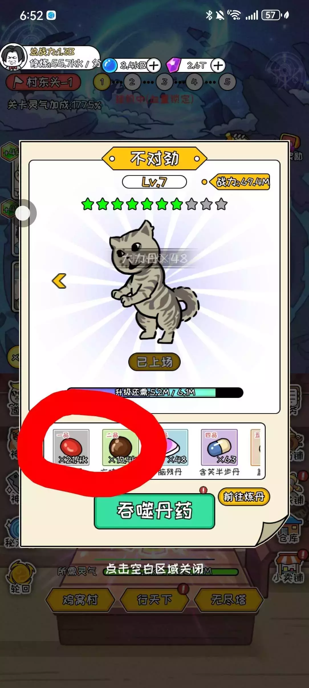 5、给神兽吞噬丹药时,以下这两个是在轮回后快速通关中获得最多的丹药,有点多,所以给吞噬的时候有点久,只要有耐心就行了。(如图8所示)