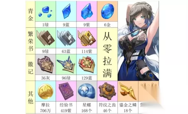 原神夜阑突破材料大全 一、80级未突破 天赋8/8/8 青金:1绿、9蓝、9紫。 繁荣书:9绿、63蓝、30紫。 徽记:36灰、96绿、42蓝。 还需要280万摩拉、247本紫色经验书,108个星螺、26个符文之齿、6个鎏金之鳞。 二、夜阑直接满级 青金:1绿、9蓝、9紫、6金。 繁荣书:9绿、63蓝、114紫 徽记:36灰、96绿、129蓝 还需要706万摩拉、419本紫色经验书,168个星螺、46个符文之齿、18个鎏金之鳞、3个知识之冕。